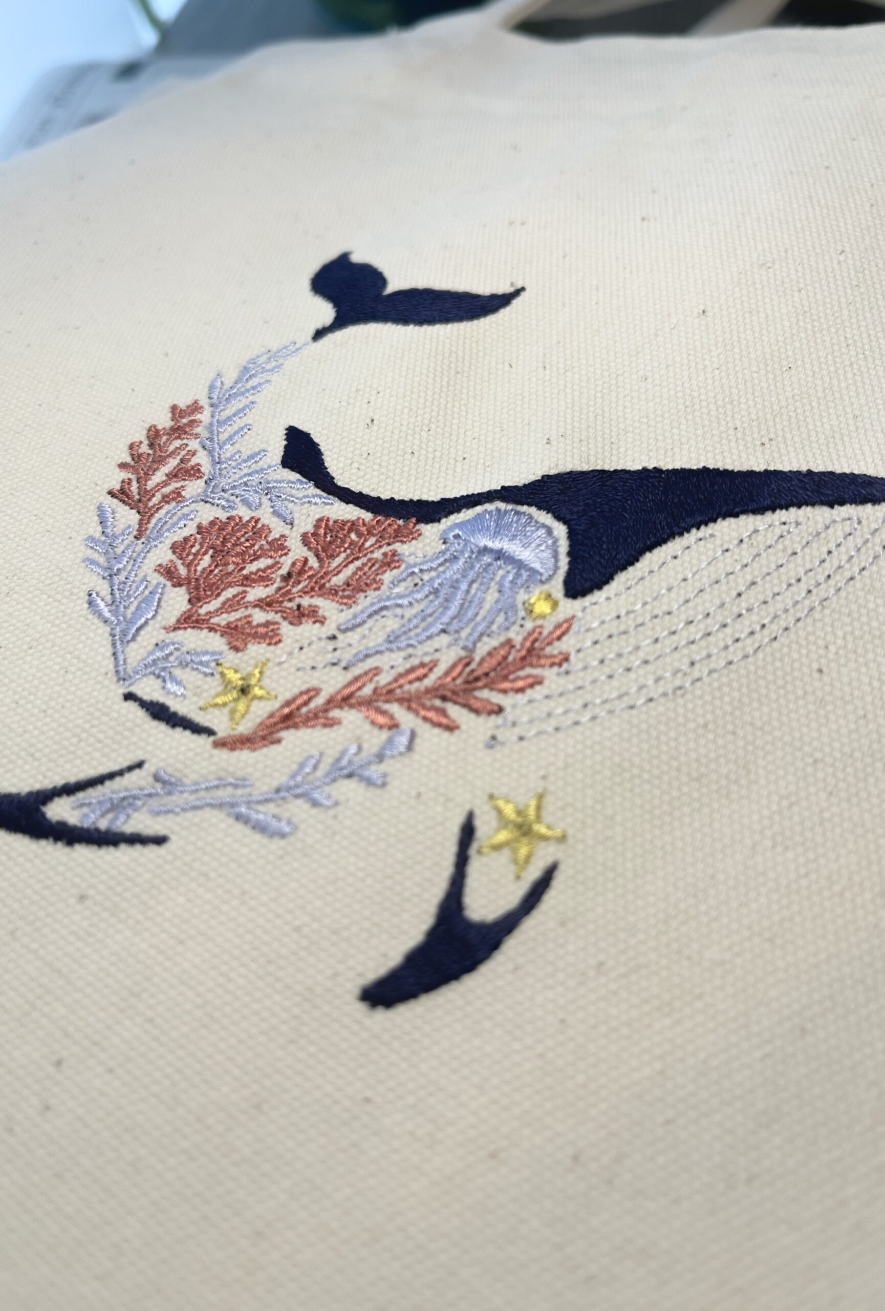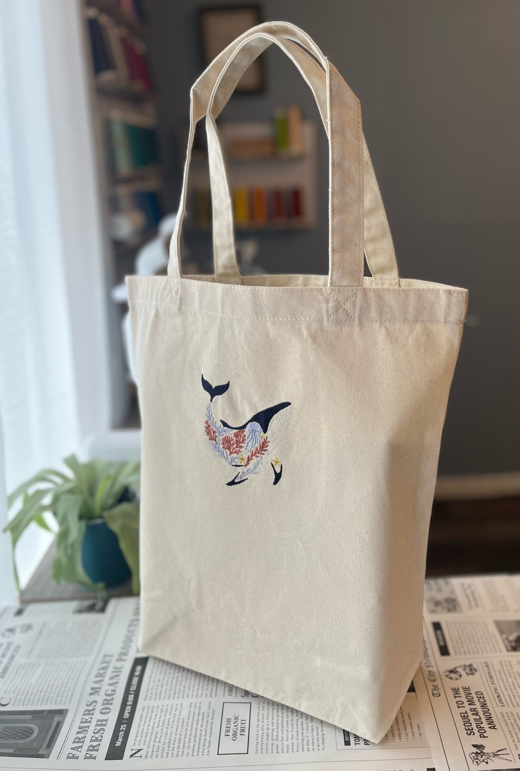 鯨を海のモチーフで表現したトートバッグです。図書館やちょっとしたお出かけの気分を上げてくれます。